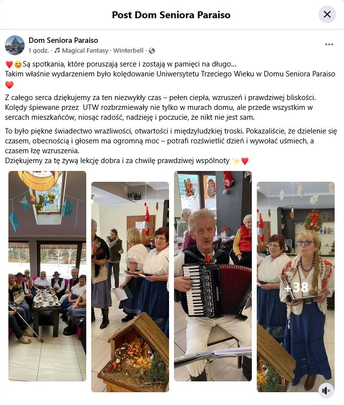 Nasza grupa kolędników odwiedziła seniorów w Domu Paraiso, niosąc ze sobą radosną nowinę i mnóstwo pozytywnej energii. Wspólne śpiewanie pastorałek oraz recytacja wierszy o Bożym Narodzeniu sprawiły, że świąteczna atmosfera rozkwitła na nowo. Najpiękniejszym momentem była jednak radość bijąca od seniorów – ich uśmiechy i wspólny śpiew były dla nas najwspanialszym prezentem. To był piękny czas! Do zobaczenia na kolędowym szlaku!